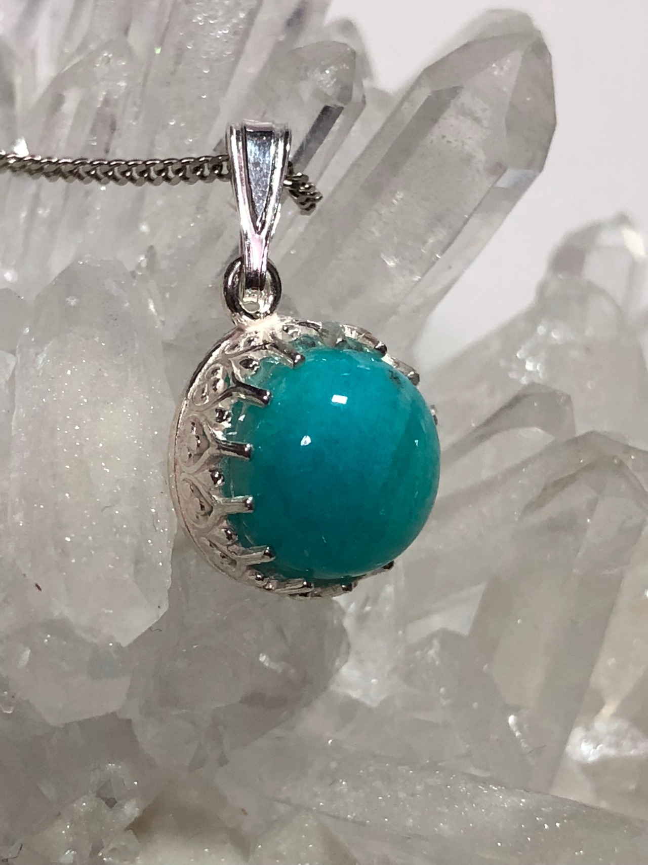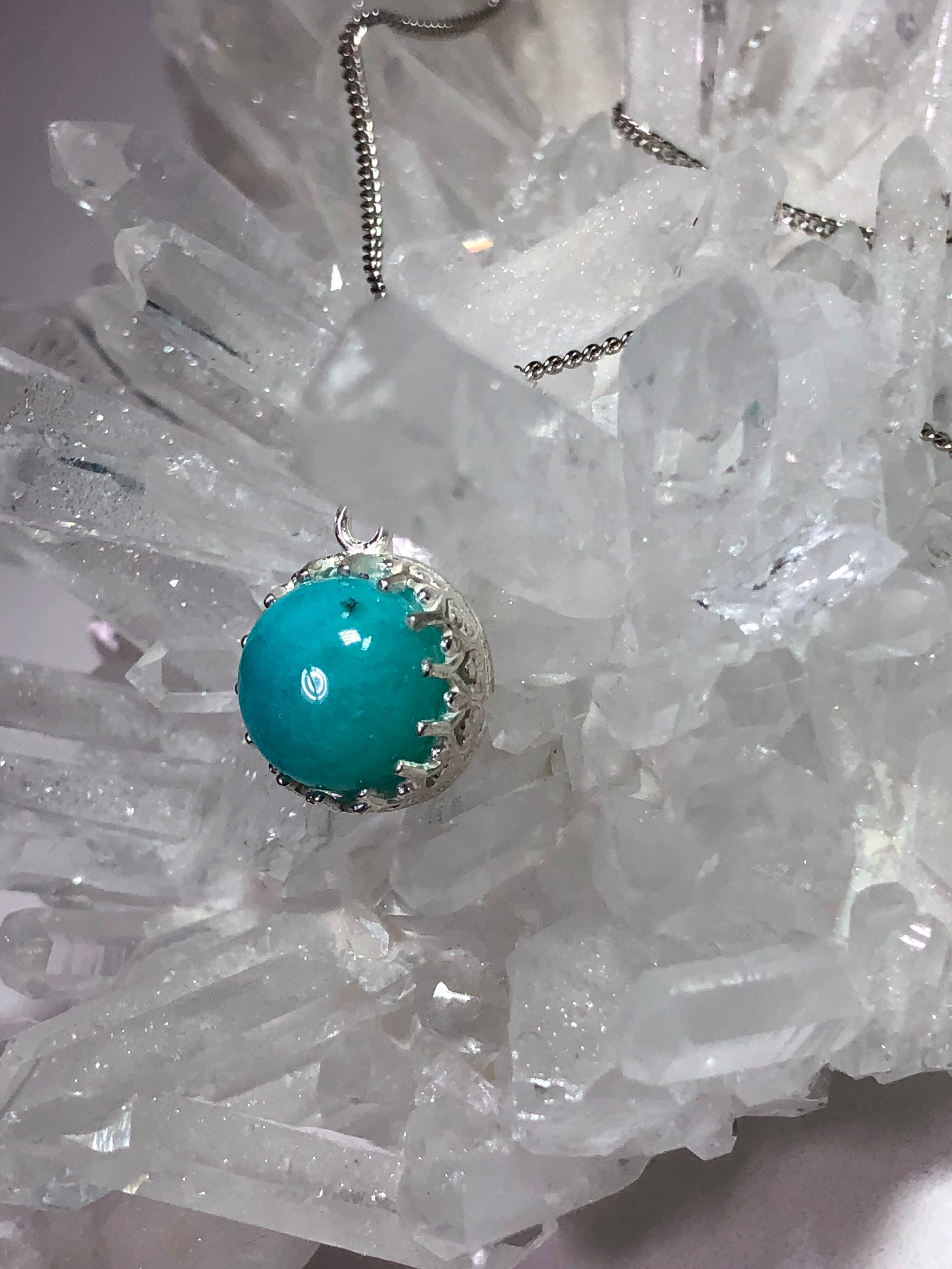 存在感のある一粒石は発色の良いペルー産アマゾナイトのカボション10㎜。