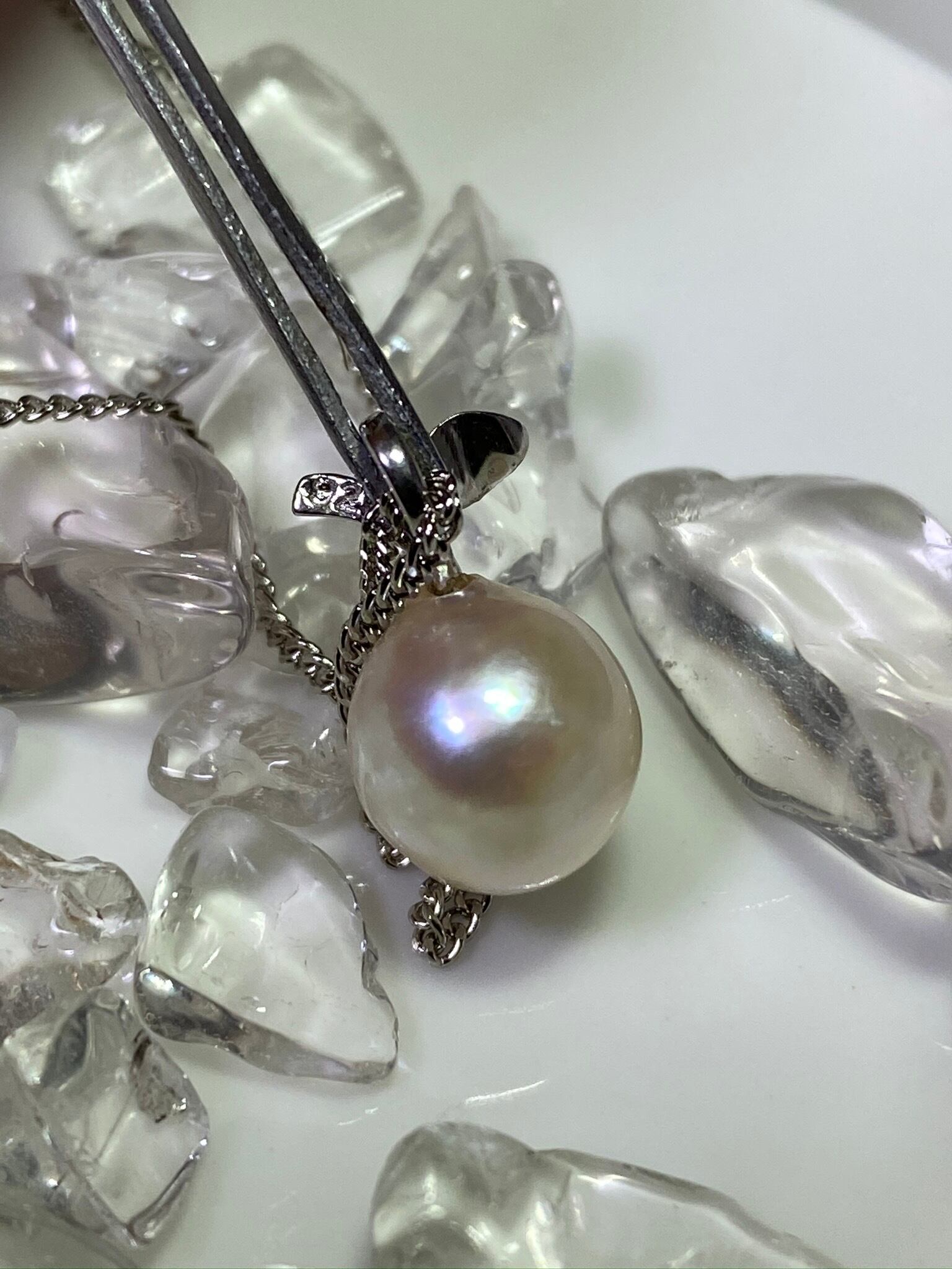 パールは片穴です。いくつかのえくぼと、小傷、巻きむらがあります。