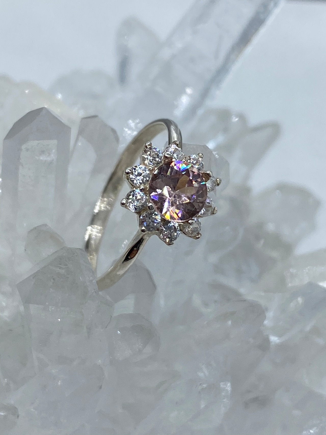 優しいピンクを取り囲むのはホワイトジルコンのメレストーン。