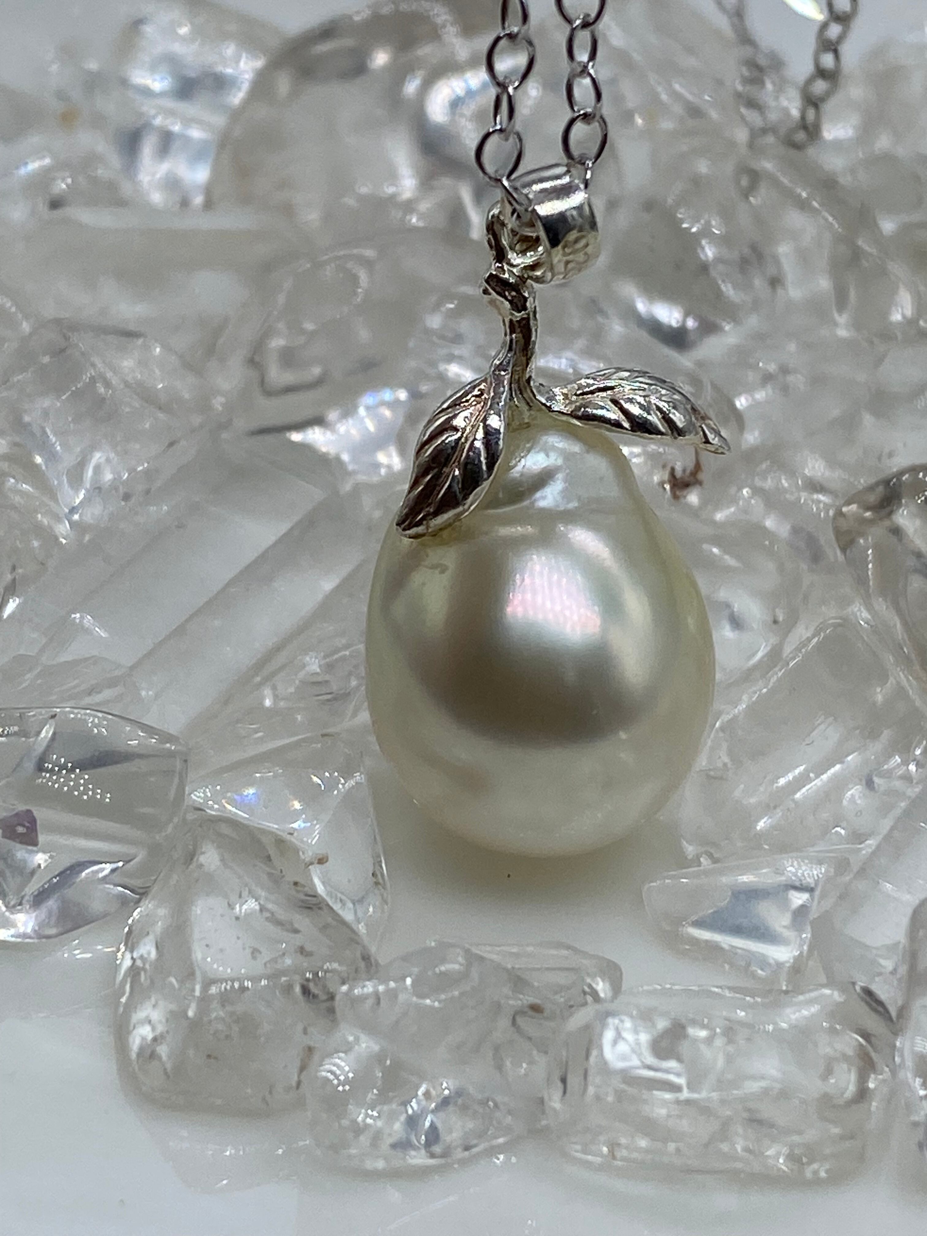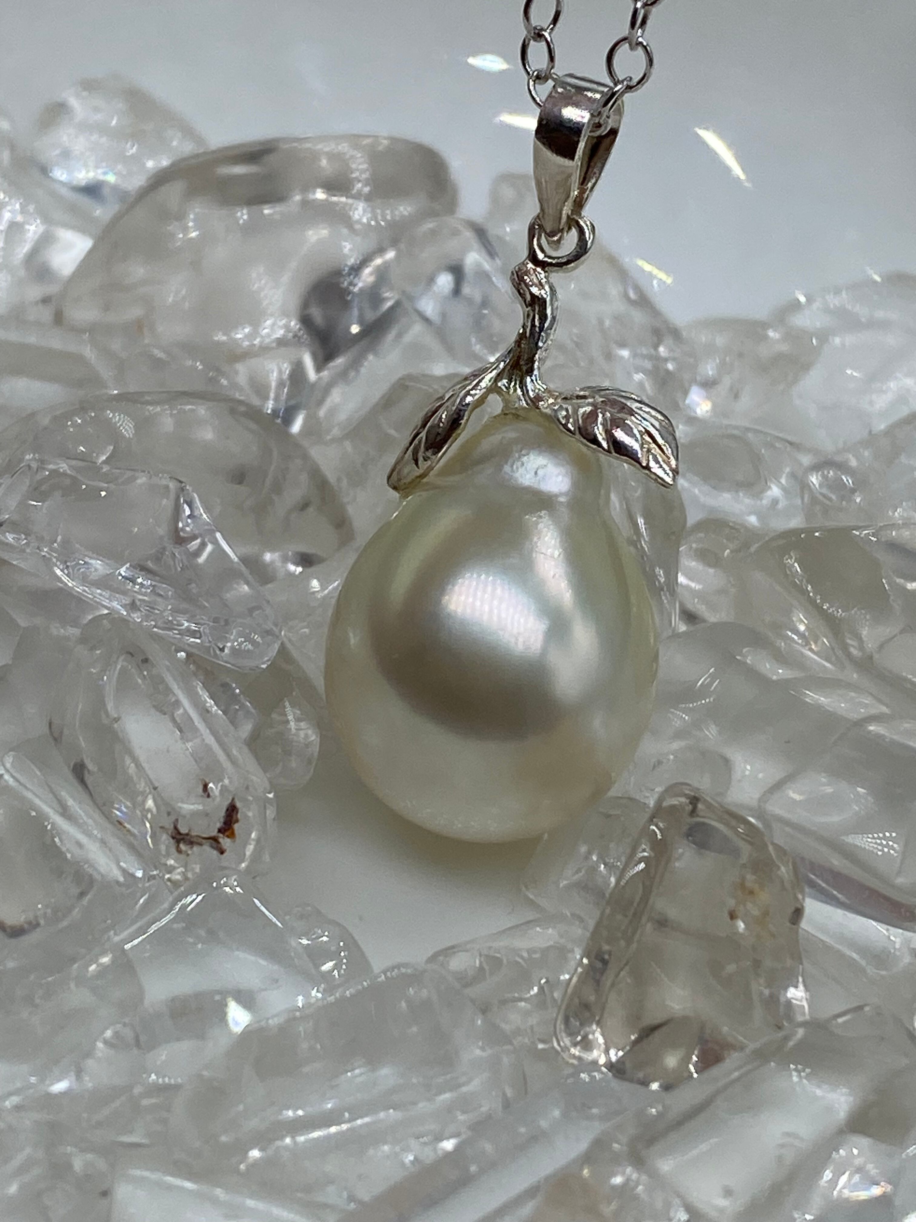 今回はこちらの、南洋白蝶真珠に、シルバー925の葉っぱと茎を付けて